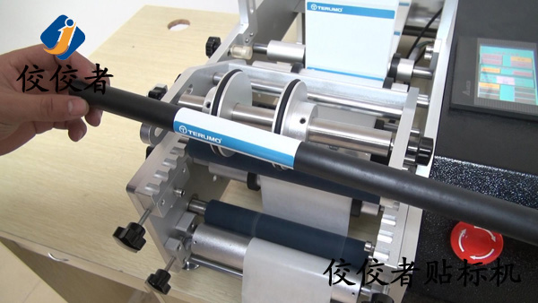 上圖展示的是工作人員將需要貼標的PE管放在方便拿取的位置以增加貼標的效率,此時有一個步驟在圖片中沒有展示出來,那就是接通電源之后需要做的就是將PE管放在包膠軸與覆標海綿軸待貼位置,可根據產品直徑的大小進行調整,然后踩腳踏,此時貼標過程已經完成.看似只有一秒鐘的時間,在這個時間中,機器進行了一系列的工作。當腳踩發出信號,電機轉動帶動PE管轉動,并送出標簽到PE管上,一邊出標一邊覆標.至此,貼標過程就已經完成了。(操作過程:放產品—>貼標并覆標(設備自動實現)—>取出已貼標產品。)如下圖: