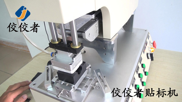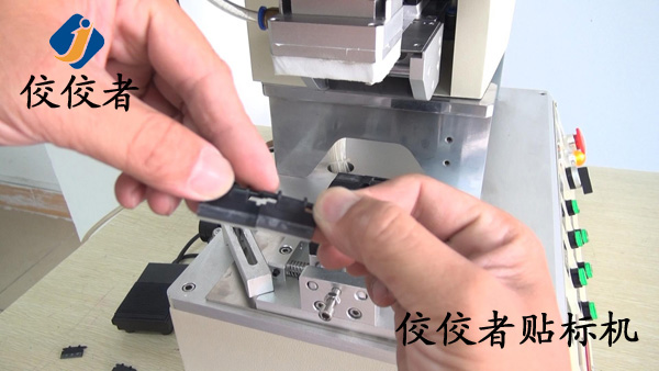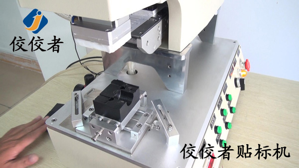 這臺(tái)高精度半自動(dòng)平面貼標(biāo)機(jī)是上海的一個(gè)客戶為小黑片定制的平面貼標(biāo)機(jī),貼標(biāo)的時(shí)候把產(chǎn)品放到上圖的黑色小方塊上面的小槽中,機(jī)器上面部分便向下運(yùn)動(dòng)為小黑片貼標(biāo),如下圖: